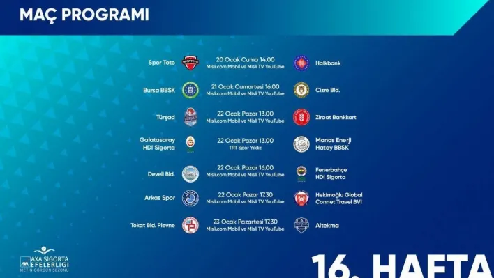 AXA Sigorta Efeler Ligi’nde 16. hafta heyecanı yarın, 21 Ocak Cumartesi, 22 Ocak Pazar ve 22 Ocak Pazartesi günü oynanacak karşılaşmalarla yaşanacak. Haftanın açılış mücadelesinde Spor Toto ile Halkbank karşı karşıya gelecek. Hafta Tokat Bld. Plevne ile Altekma arasında oynanacak maçla tamamlanacak.