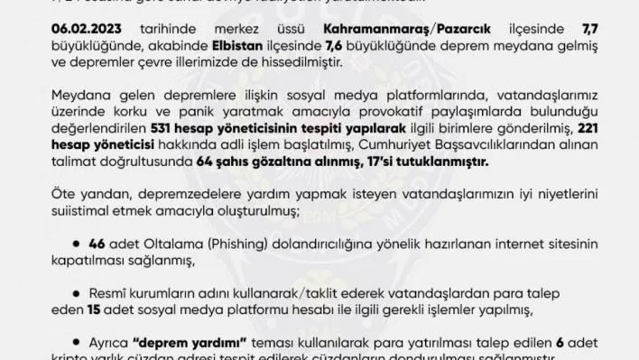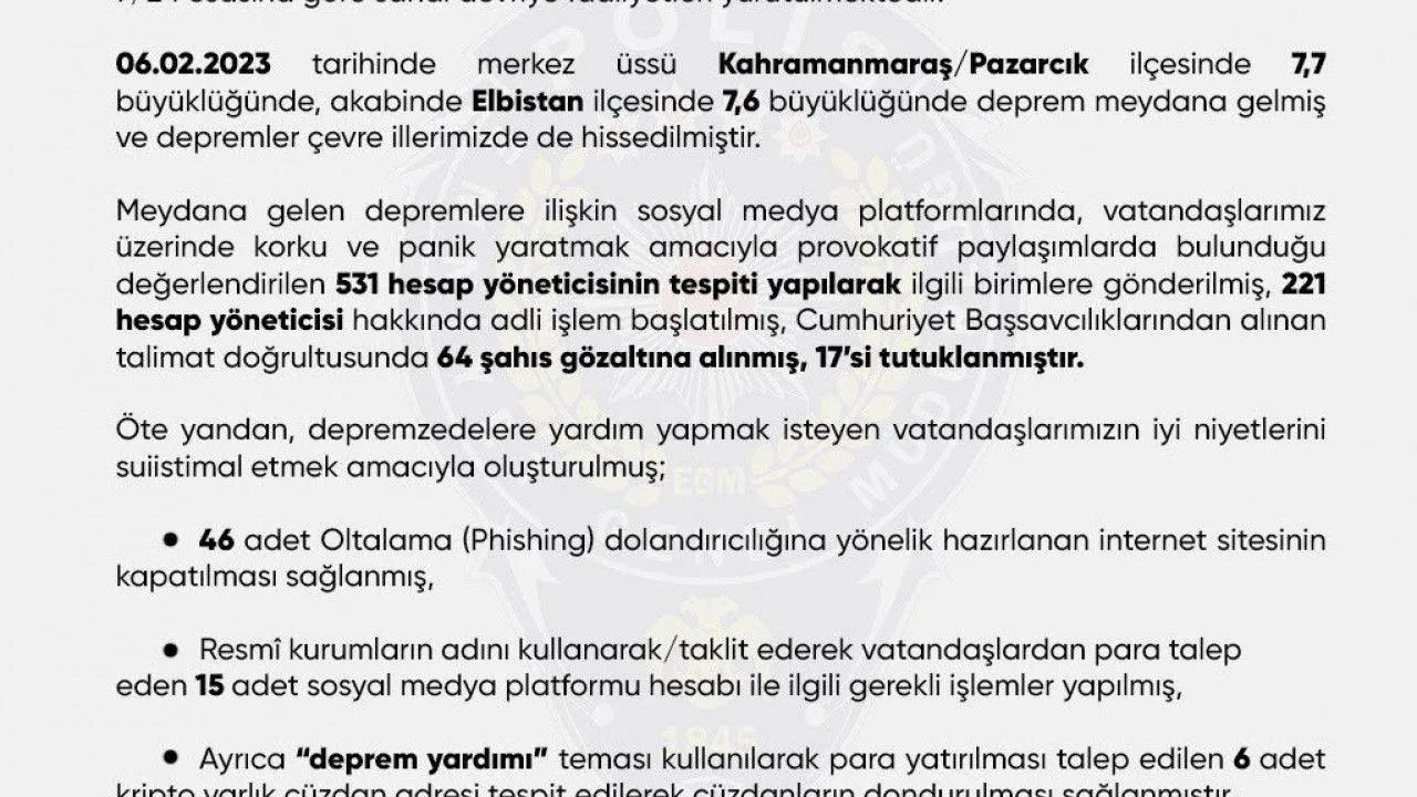EGM Siber Suçlarla Mücadele Daire Başkanlığı tarafından yapılan açıklamada, "Kahramanmaraş’ta meydana gelen depremler sonrasında sosyal medya platformları üzerinden yardım çağrısında bulunan vatandaşlarımızın adres ve lokasyon bilgileri ivedilikle tespit edilerek, ilgili birimlerle koordinasyon kurulmaktadır. Ayrıca Kahramanmaraş merkezli yaşanan depremlere ilişkin sosyal medya platformlarında, vatandaşlarımız üzerinde korku ve panik oluşturmak amacıyla provokatif paylaşımlarda bulunduğu değerlendirilen 531 hesap yöneticisinin tespiti yapılarak ilgili birimlere gönderilmiş, Cumhuriyet başsavcılıklarınca alınan talimat gereği 64 şahıs gözaltına alınmış, 17’si tutuklanmıştır" denildi.