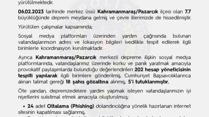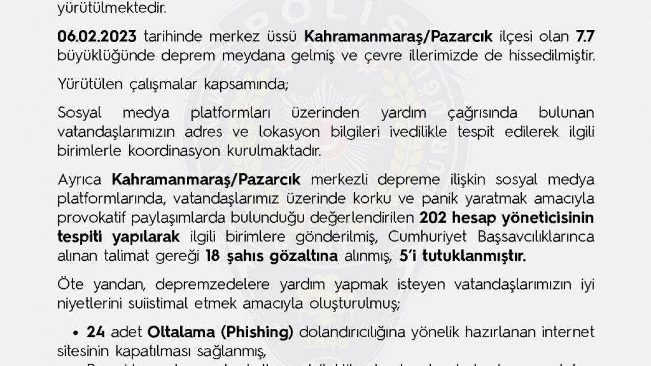 EGM’nin sosyal medya üzerinden yaptığı açıklamada, “Emniyet Genel Müdürlüğü Siber Suçlarla Mücadele Daire Başkanlığınca, kanunların verdiği yetki çerçevesinde, suç ve suçlularla mücadele amacıyla, internet ortamında 7 gün 24 saat esasına göre sanal devriye faaliyetleri yürütülmektedir. Kahramanmaraş’ın Pazarcık ilçesinde meydana gelen 7.7 büyüklüğünde deprem meydana gelmiş ve çevre illerimizde de hissedilmiştir. Yürütülen çalışmalar çerçevesinde sosyal medya platformları üzerinden yardım çağrısında bulunan vatandaşlarımızın adres ve lokasyon bilgileri ivedilikle tespit edilerek ilgili birimlerle koordinasyon kurulmaktadır. Ayrıca Kahramanmaraş merkezli depreme ilişkin sosyal medya platformlarında, vatandaşlarımız üzerinde korku ve panik oluşturmak amacıyla provokatif paylaşımlarda bulunduğu değerlendirilen 202 hesap yöneticisinin tespiti yapılarak ilgili birimlere gönderilmiş, Cumhuriyet Başsavcılıklarınca alınan talimat gereği 18 şahıs gözaltına alınmış, 5’i tutuklanmıştır. Öte yandan, depremzedelere yardım yapmak isteyen vatandaşlarımızın iyi niyetlerini suistimal etmek amacıyla oluşturulmuş; 24 adet Oltalama (Phishing) dolandırıcılığına yönelik hazırlanan internet sitesinin kapatılması sağlanmış, resmi kurumların adını kullanarak veya taklit ederek vatandaşlardan para talep eden 4 adet sosyal medya platformu hesabı ile ilgili gerekli işlemler yapılmış, ayrıca "deprem yardımı" teması kullanılarak para yatırılması talep edilen 3 adet kripto varlık cüzdan adresi tespit edilerek cüzdanların dondurulması sağlanmıştır” denildi.