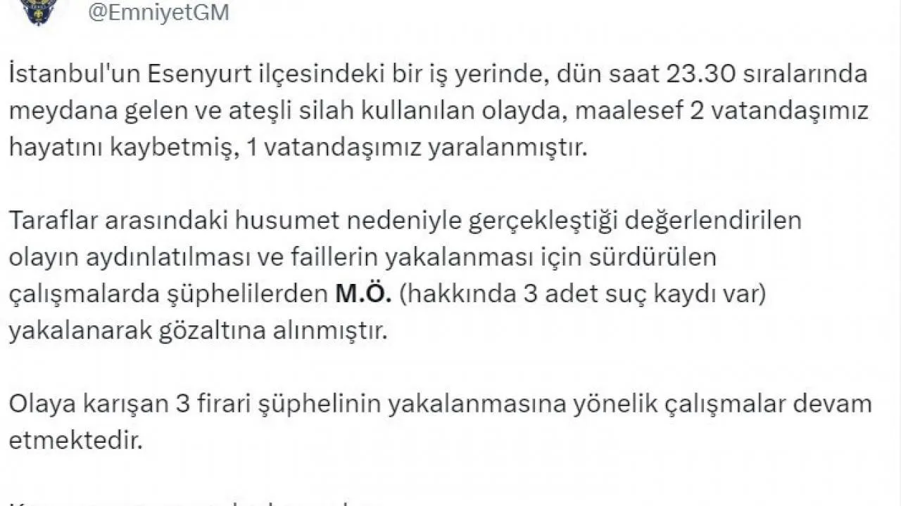 EGM, sosyal medya hesabından İstanbul Esenyurt’ta yaşanan silahlı saldırının faillerinden M.Ö.’nün yakalanarak gözaltına alındığını duyurdu. EGM sosyal medya paylaşımında, “İstanbul’un Esenyurt ilçesindeki bir iş yerinde, dün saat 23.30 sıralarında meydana gelen ve ateşli silah kullanılan olayda, maalesef 2 vatandaşımız hayatını kaybetmiş, 1 vatandaşımız yaralanmıştır. Taraflar arasındaki husumet nedeniyle gerçekleştiği değerlendirilen olayın aydınlatılması ve faillerin yakalanması için sürdürülen çalışmalarda şüphelilerden M.Ö. (hakkında 3 adet suç kaydı var) yakalanarak gözaltına alınmıştır. Olaya karışan 3 firari şüphelinin yakalanmasına yönelik çalışmalar devam etmektedir” ifadelerine yer verdi.