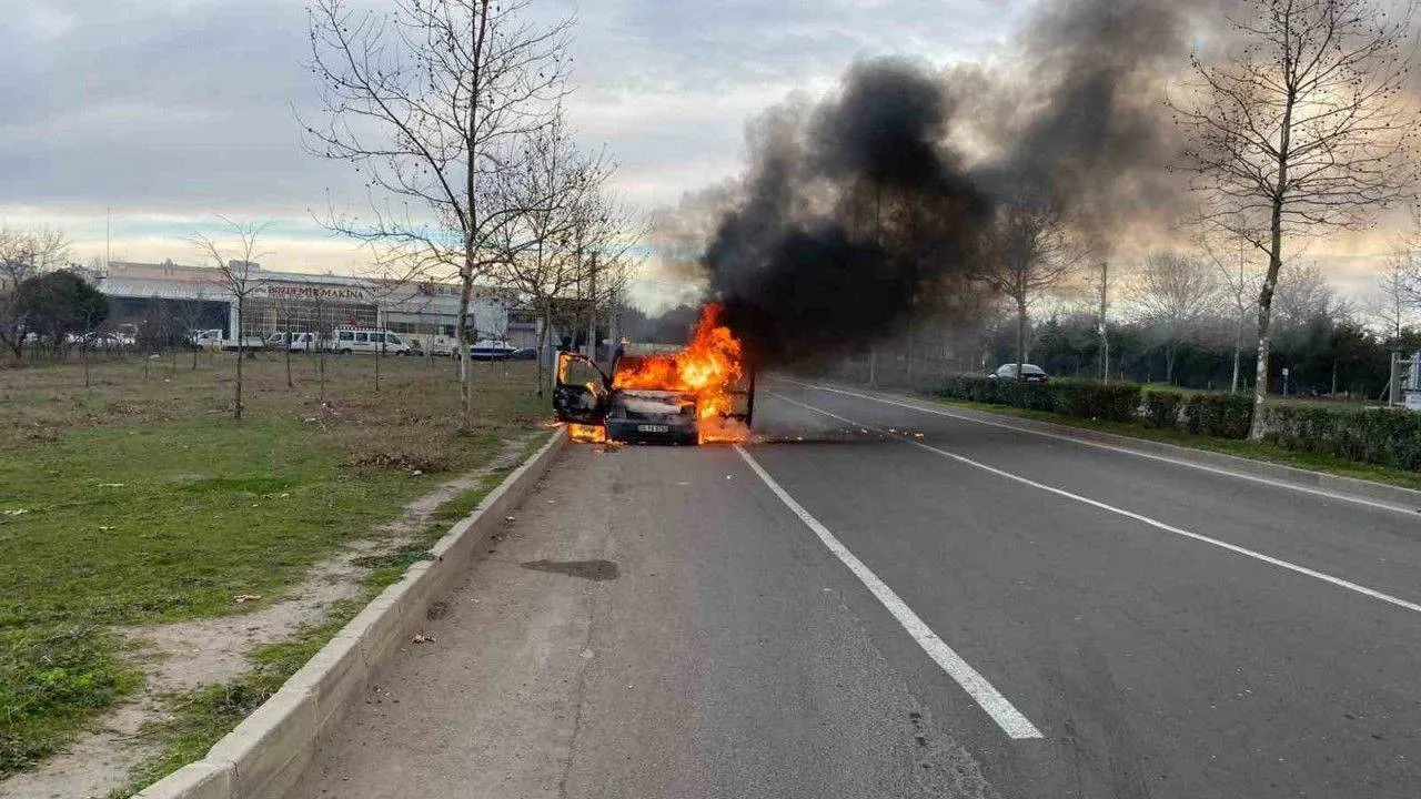 Tekirdağ Çorlu’da bir vatandaşın, hastaneye gitmek için emanet aldığı araba alev topuna döndü. Yanan araç hurda hurda yığınına döndü.