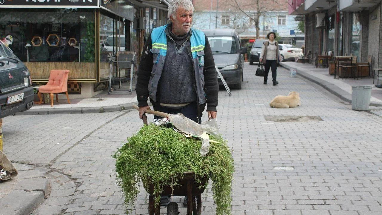 Balıkesir’in Manyas ilçesinde emekli temizlik işçisi fahri olarak ilçeyi tertemiz yapıyor.
