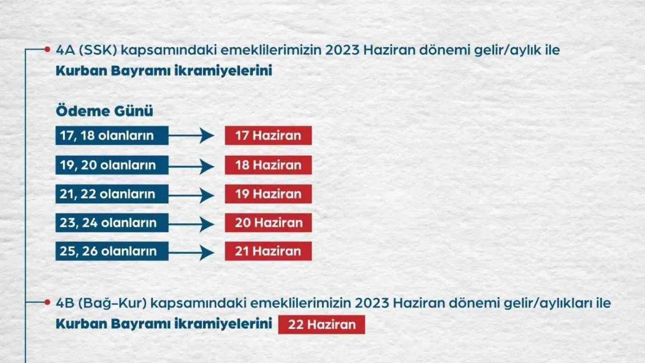Çalışma ve Sosyal Güvenlik Bakanlığından yapılan açıklama ile 17-23 Haziran tarihleri arasında emekli maaşları ve bayram ikramiyelerinin hesaplara yatırılacağı duyurulmuştu. Bu çerçevede Sosyal Güvenlik Kurumundan (SGK) yapılan bildiride 4A (SSK) kapsamındaki emeklilerden ödeme günü 17 ve 18 olanlar için ödemelerin başladığını belirtildi. Ödeme günü 19 ve 20 Haziran olanların ödemeleri ayın 18’de, ödeme günü 21 ve 22 Haziran olanların ödemeleri ayın 19’unda, ödeme günü 23, 24 olanların ödemeleri ayın 20’sinde, 25,26 olanların ödemeleri ise ayın 21’inde yapılacak.