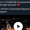 Emine Erdoğan, NSosyal hesabından dün Cumhurbaşkanlığı Külliyesi Sergi Salonu’nda düzenlenen 29 Ekim Cumhuriyet Bayramı Özel Programı’na ilişkin paylaşım yaptı. Paylaşımında "Cumhuriyet’imizin 102. yılı. Bir asrı aşan bu kutlu yürüyüş, aziz Türk milletinin azmi ve fedakarlığı ile güçlenerek geleceğe taşınıyor" ifadelerini kullanan Emine Erdoğan, Cumhuriyet Bayramı etkinliklerinden derlenen bir videoya da yer verdi. Videoda 29 Ekim Özel Programı, 102. yıl dönümü kutlamaları kapsamındaki yürüyüş, Cumhurbaşkanlığı Külliyesi’nde gerçekleştirilen sıcak hava balonu etkinliği ve Milli Savunma Bakanlığı Mehteran Birliği’nin gösterisinden kesitler yer aldı. Videoda ayrıca Cumhurbaşkanı Erdoğan’ın 29 Ekim Özel Programı’nda yaptığı konuşmasındaki şu ifadelere yer verildi:
