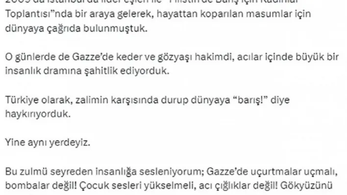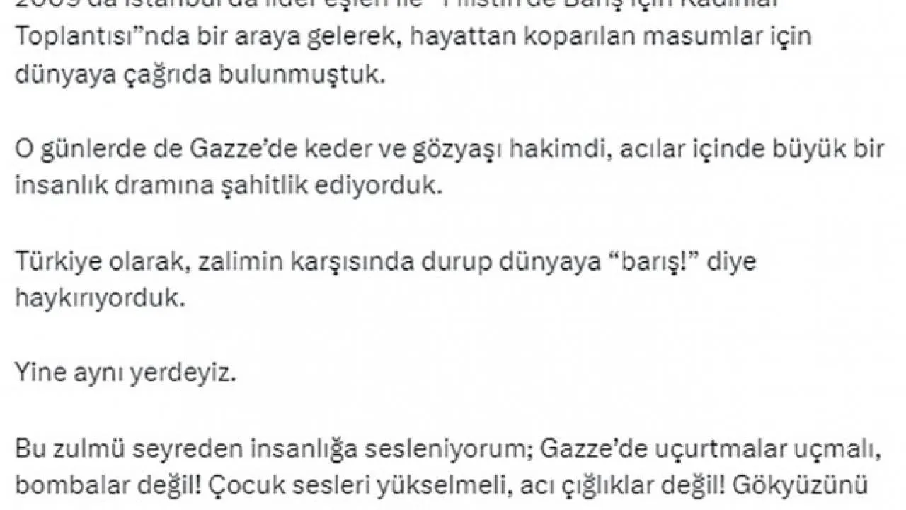 2009’da İstanbul’da lider eşleri ile ‘Filistin’de Barış için Kadınlar Toplantısı’nda bir araya gelerek hayattan koparılan masumlar için dünyaya çağrıda bulunduklarını hatırlatan Emine Erdoğan, “O günlerde de Gazze’de keder ve gözyaşı hakimdi, acılar içinde büyük bir insanlık dramına şahitlik ediyorduk. Türkiye olarak zalimin karşısında durup dünyaya ‘barış’ diye haykırıyorduk, yine aynı yerdeyiz. Bu zulmü seyreden insanlığa sesleniyorum; Gazze’de uçurtmalar uçmalı, bombalar değil. Çocuk sesleri yükselmeli, acı çığlıklar değil. Gökyüzünü bulutlar kaplamalı, dumanlar değil” ifadelerini kullandı.