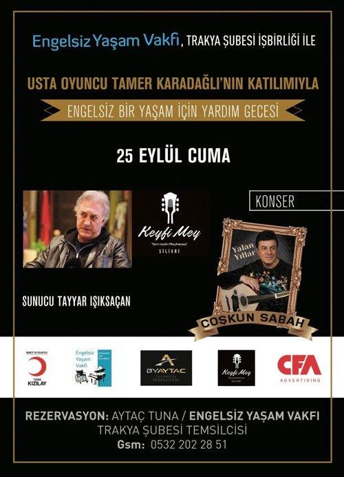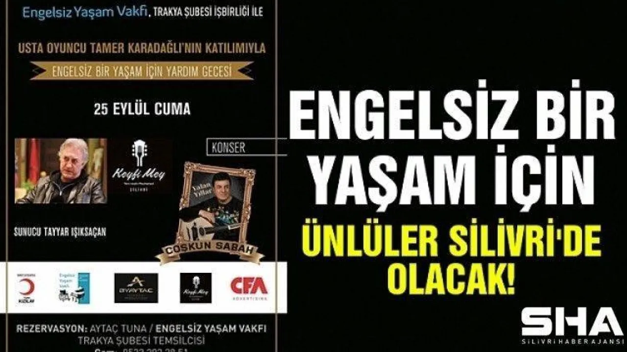 Oyuncu Tamer Karadağlı'nın katılacağı ve Sanatçı Coşkun Sabah'ın sahne alacağı Engelsiz Yaşam Vakfı Trakya Şubesi işbirliğiyle organize edilen gece 25 Eylül Cuma günü Silivri'de yapılacak.