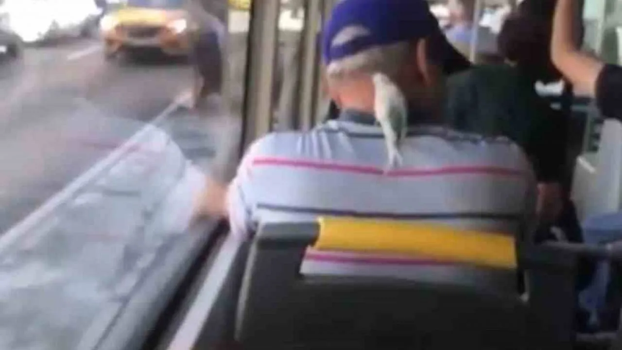 Bursa'da bir vatandaş halk otobüsüne muhabbet kuşuyla bindi. Kafesinde olmayan kuş yaşlı adamın ensesi üzerinde seyahat ederken, yüzleri tebessüm ettiren görüntü cep telefonu kamerasıyla kaydedildi.