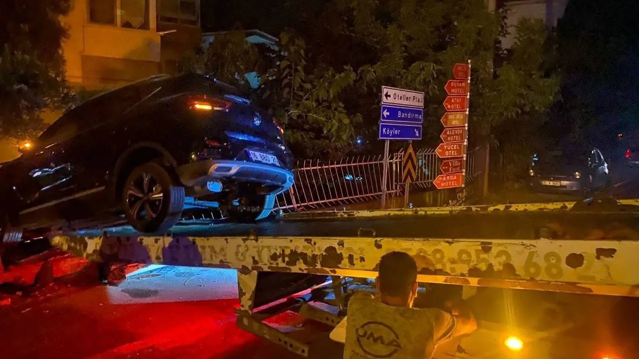 Erdek'te otomobil sitenin duvarını yıkarak asılı kaldı