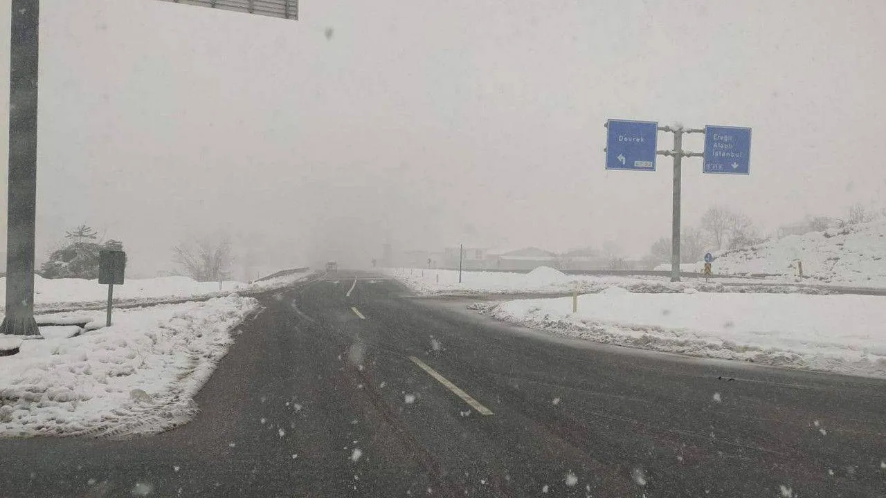 Zonguldak’ın Ereğli ilçesinde etkili olan kar yağışı nedeniyle Zonguldak-Ereğli karayolu uzun araçlara kapatıldı.