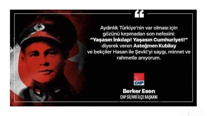 CHP Silivri İlçe Başkanı Berker Esen, Menemen'de asteğmen Mustafa Fehmi Kubilay'in şehit edilişinin 91. yıldönümü dolayısıyla bir mesaj yayımladı.