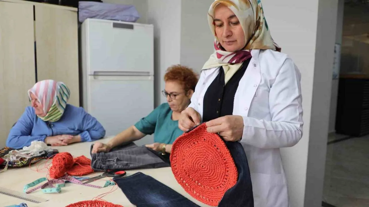 Dekoratif El Sanatları eğitmeni Nazmiye Turan, kursiyerlerin atölyede verimli işlere imza attıklarını kaydederek “Burada dönüşüme katkıda bulunuyoruz. Bu bizi çok mutlu ediyor. Şu an hanımlar kendi evlerinde kullanmadıkları ya da kullanım sıkıntısı çektikleri ürünleri getiriyor ve burada dönüştürüyorlar. Bugünkü ödevimiz kot pantolon ve kot etekleri dönüştürmek. Bunları önlük ve çantalara dönüştürüyoruz. Bizler daha önceki neslimizin yani annelerimizin yaptığı gibi evdeki kullanmadığımız ya da eskiyen ürünleri atmadan birilerine vermek yerine onları dönüştürüp yeniden kullanıma hazırlıyoruz. Yani burada bir anlamda atıksız hayatı oluşturuyoruz. Günümüzün tüketim çılgınlığına bir nebze de olsun ‘dur’ diyoruz. Kurs sonunda bir de sergi açmak istiyoruz. İnsanlar da neleri dönüştürdüğümüzü görerek şuurlansın istiyoruz. Ayrıca ellerindekilerin kıymetini bilmelerine de vesile olmayı hedefliyoruz” ifadelerini kullandı.