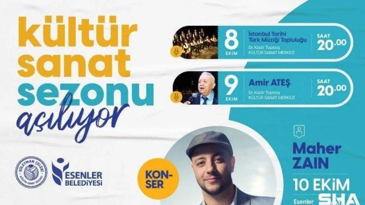 Esenler Belediyesi, '2021-2022 Süleyman Çelebi Kültür Sanat Sezonu' açılışını 3 gün boyunca devam edecek etkinliklerle gerçekleştirecek. Etkinlikler kapsamında Lübnan asıllı Müslüman şarkıcı Maher Zain, iki yıl aradan sonra Türkiye'deki ilk konserini Esenler'de verecek. Zain, 10 Ekim'de Dörtyol Meydanı'nda vereceği konserle sevenleriyle buluşacak.