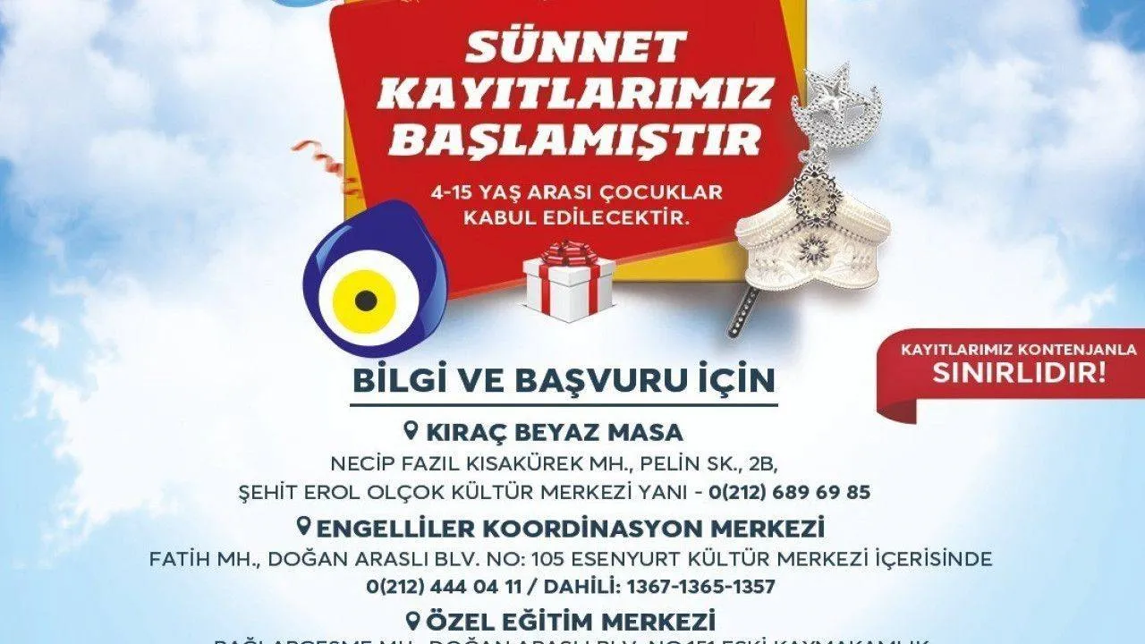 Esenyurt Belediyesi'nin, her yıl düzenlediği toplu sünnet organizasyonu için kayıtlar alınmaya başlandı. Vatandaşlar, 2 Haziran tarihine kadar kendilerine en yakın merkeze giderek başvurularını yapabilecek.