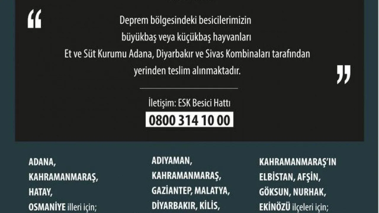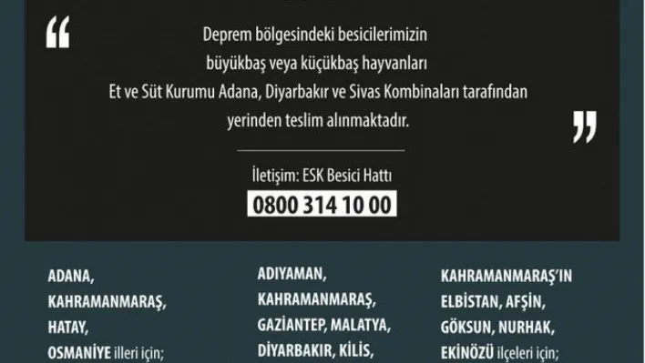 ESK’nin sosyal medya hesabından yapılan açıklamada, “Depremden etkilenen üreticilerimizin sahipsiz kalmış veya bakım imkanı olmayan hayvanları Et ve Süt Kurumu tarafından mahallinden alınmakta, kesimlik hayvanlar kombinalarımıza, genç veya gebe hayvanlar ise bakım ve beslenmesi için TİGEM işletmelerine sevk edilmektedir” ifadelerine yer verildi.