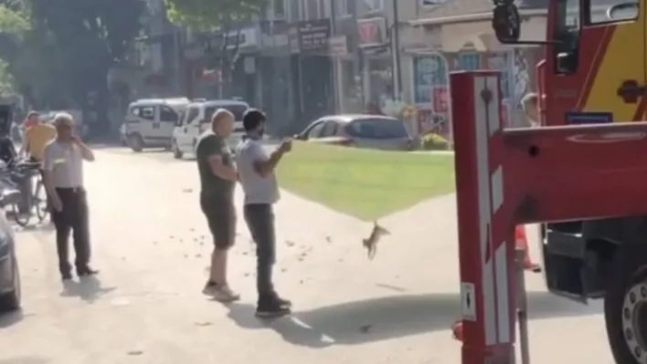 Bursa'nın İnegöl ilçesinde ağaca çıkan kedi, itfaiye ekipleri ile esnaflar tarafından kurtarıldı. O anlar amatör kameraya yansıdı.