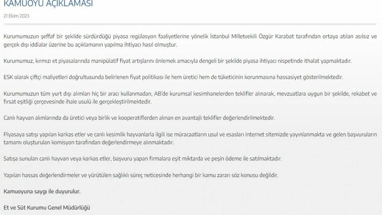 “Kurumumuz, kırmızı et piyasalarında manipülatif fiyat artışlarını önlemek amacıyla dengeli bir şekilde piyasa ihtiyacı nispetinde ithalat yapmaktadır. ESK olarak çiftçi maliyetleri doğrultusunda belirlenen fiyat politikası ile hem üretici hem de tüketicinin korunmasına hassasiyet gösterilmektedir. Kurumumuzun tüm yurt dışı alımları hiçbir aracı kullanmadan, AB’de kurumsal kesimhanelerden teklifler alınarak, mevzuatlara uygun bir şekilde, rekabet ve fırsat eşitliği çerçevesinde ihale usulü ile gerçekleştirilmektedir.”