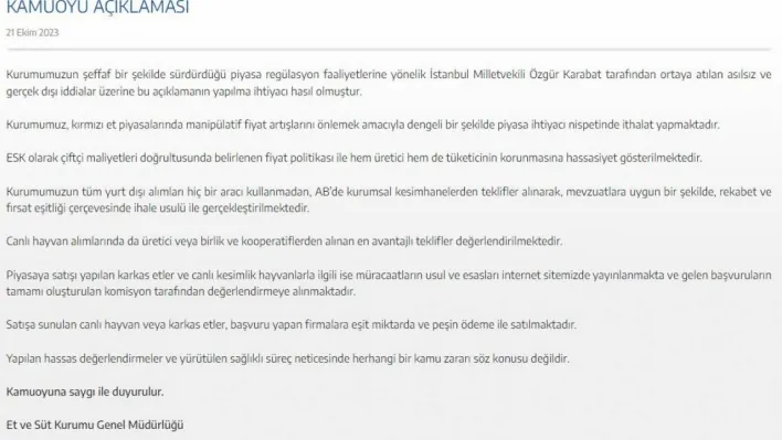 CHP milletvekili Özgür Karabat geçtiğimiz günlerde Et ve Süt kurumunda ithal edilen etlerle rant sağlandığını ve kurumun zarara uğratıldığını iddia etmişti. ESK, Karabat’ın iddialarını yalanlarken yapılan açıklamada, şu ifadelere yer verildi: