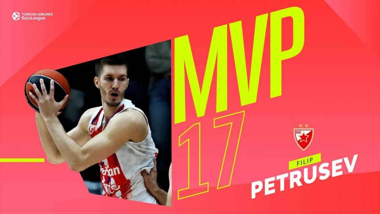 THY Euroleague’de 17. haftanın en değerli oyuncusu (MVP) Kızılyıldız’da 36 verimlilik puanı ile oynayan Sırp basketbolcu Filip Petrusev oldu.