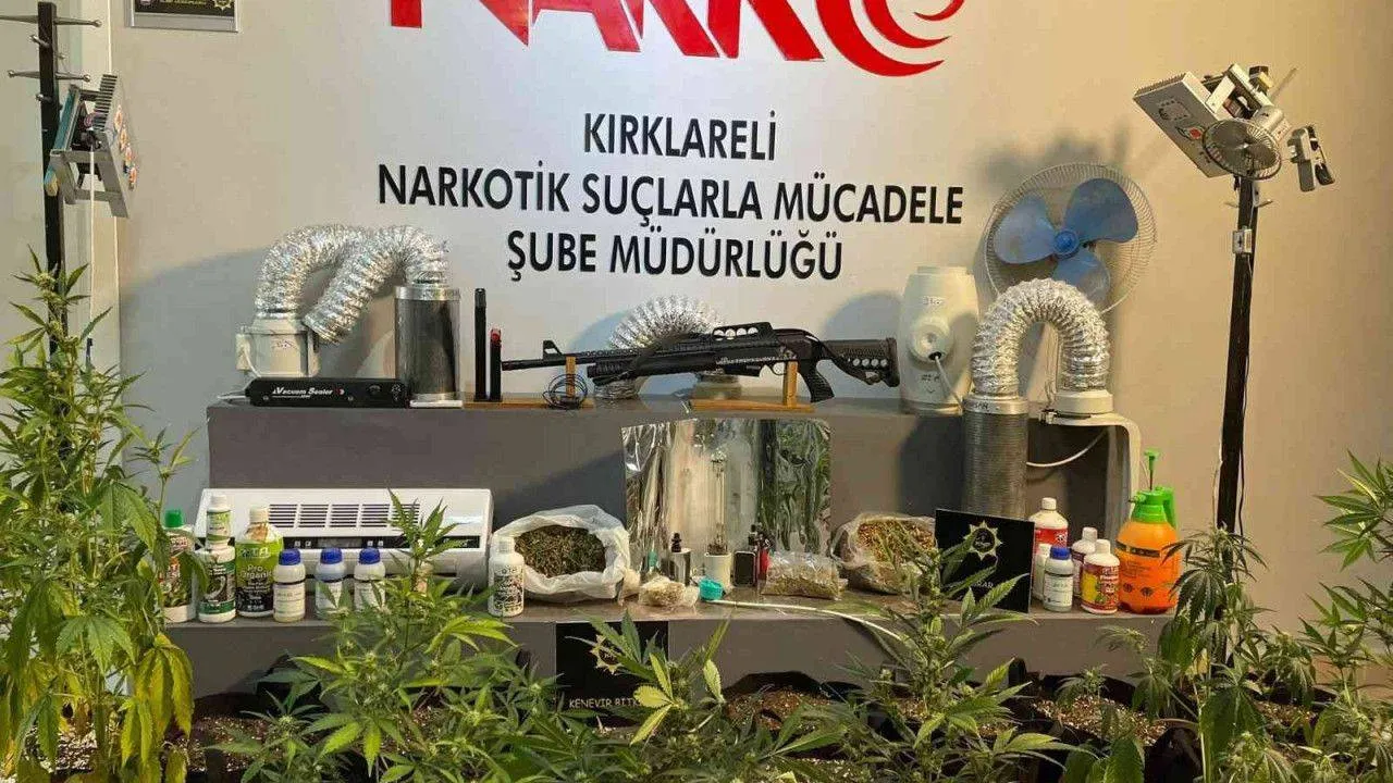 Alınan bilgiye göre, Lüleburgaz ilçesinde B.Ş.U. isimli şüphelinin evinin odasına kurduğu iklimlendirme sistemiyle Hint keneviri yetiştirdiği bilgisine ulaşan İl Emniyet Müdürlüğü Narkotik Suçlarla Mücadele Şubesi ekipleri çalışma başlattı. Şüpheliye yönelik Narkotik Suçlarla Mücadele Daire Başkanlığı koordinesinde operasyon düzenlendi. Düzenlenen operasyonda uyuşturucu üretiminde kullanılan bitki yetiştirme kabini, renkli led lamba, termometre, nem düzenleyici, fan, pH ölçer, bitki hormon ilacı ile 2 kilo 200 gram esrar, 25 saksıda ekili Hint keneviri, av tüfeği, silaha ait 2 şarjör ve 6 fişek ele geçirildi.