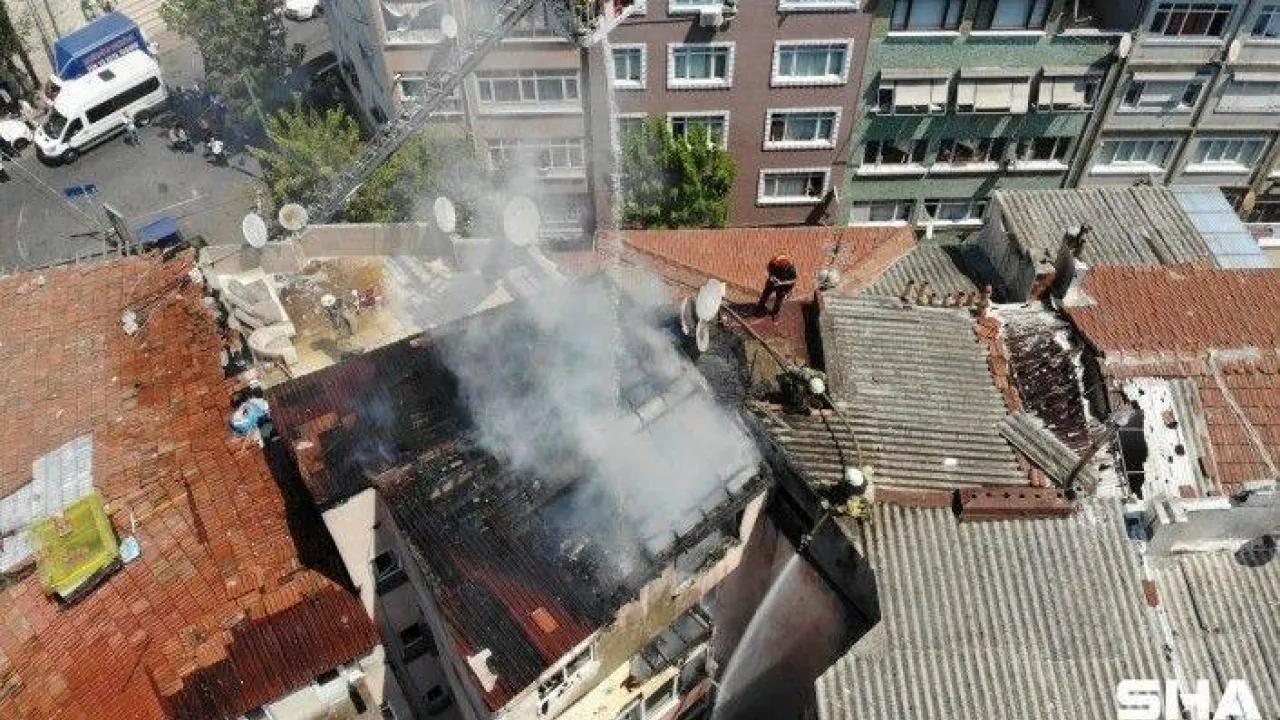 Fatih'te 4 katlı bir binanın çatısında henüz belirlenemeyen bir nedenle yangın çıktı. İtfaiye ekiplerinin alevlere müdahalesi havadan görüntüledi.