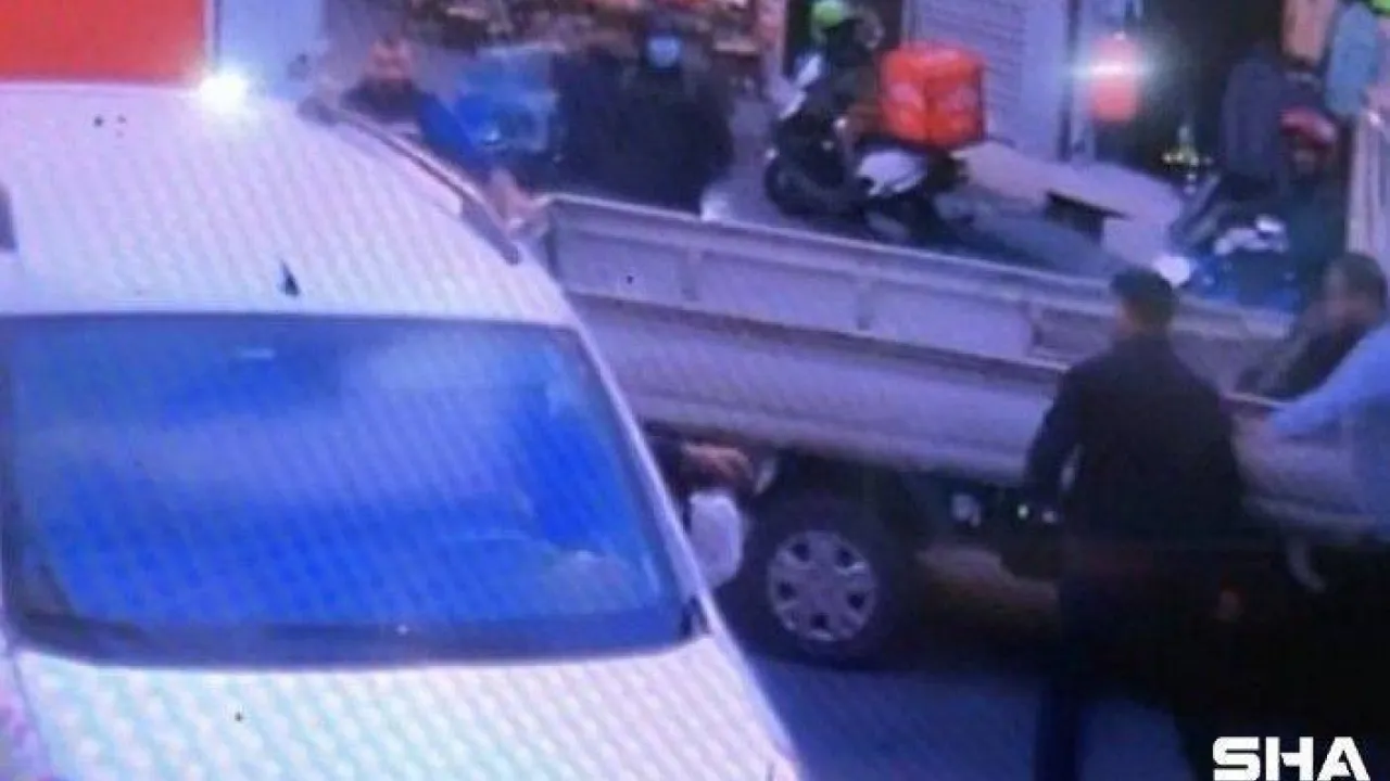 Güvenlik kameralarına yansıyan görüntülerde, sürücülerin tartışması görülüyor. Otomobilden inen bıçaklı saldırgan kamyonetteki sürücülere saldırıyor. Çevredekiler kavgayı ayırıyor.