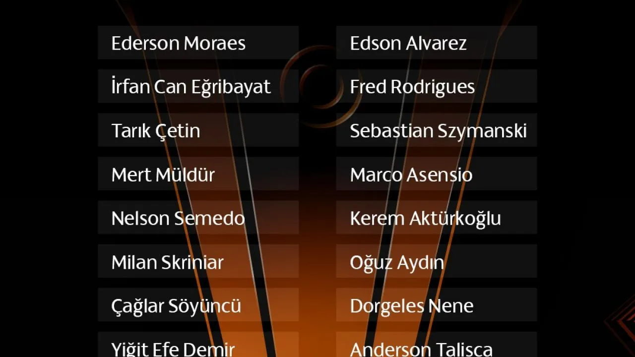 "Ederson Moraes, İrfan Can Eğribayat, Tarık Çetin, Mert Müldür, Nelson Semedo, Milan Skriniar, Çağlar Söyüncü, Yiğit Efe Demir, Archie Brown, Jayden Oosterwolde, İsmail Yüksek, Edson Alvarez, Fred, Sebastian Szymanski, Marco Asensio, Oğuz Aydın, Kerem Aktürkoğlu, Dorgeles Nene, Anderson Talisca, Youssef En-Nesyri, Jhon Duran."