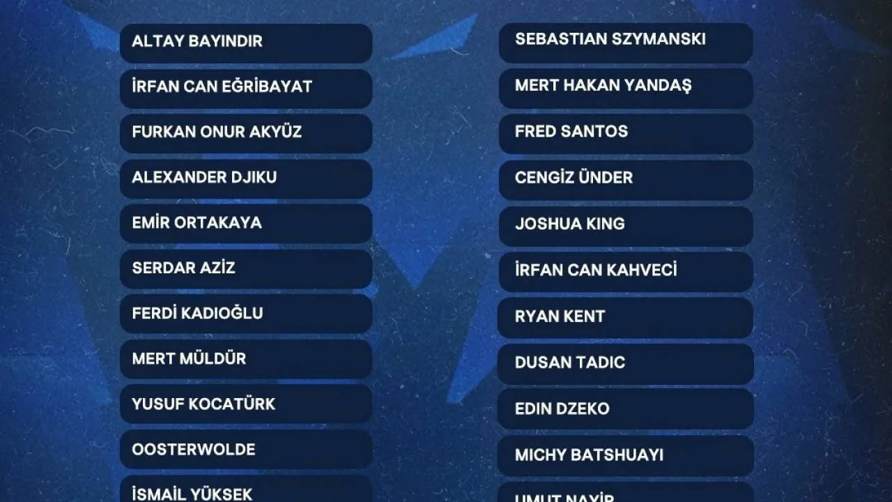 "Altay Bayındır, İrfan Can Eğribayat, Furkan Onur Akyüz, Alexander Djiku, Emir Ortakaya, Serdar Aziz, Ferdi Kadıoğlu, Mert Müldür, Yusuf Kocatürk, Jayden Oosterwolde, İsmail Yüksek, Bartuğ Elmaz, Sebastian Szymanski, Mert Hakan Yandaş, Fred Santos, Cengiz Ünder, Joshua King, İrfan Can Kahveci, Ryan Kent, Dusan Tadic, Edin Dzeko, Michy Batshuayi, Umut Nayir."