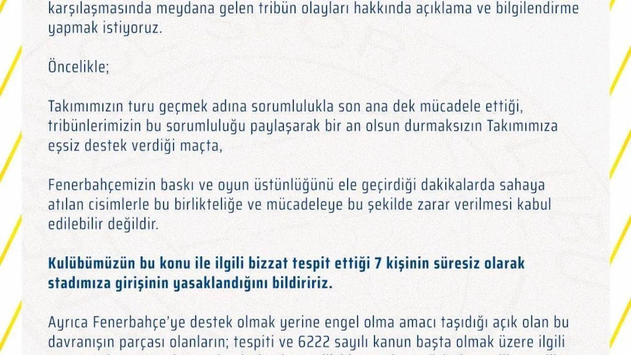 Takımımızın turu geçmek adına sorumlulukla son ana dek mücadele ettiği, tribünlerimizin bu sorumluluğu paylaşarak bir an olsun durmaksızın Takımımıza eşsiz destek verdiği maçta, Fenerbahçemizin baskı ve oyun üstünlüğünü ele geçirdiği dakikalarda sahaya atılan cisimlerle bu birlikteliğe ve mücadeleye bu şekilde zarar verilmesi kabul edilebilir değildir.