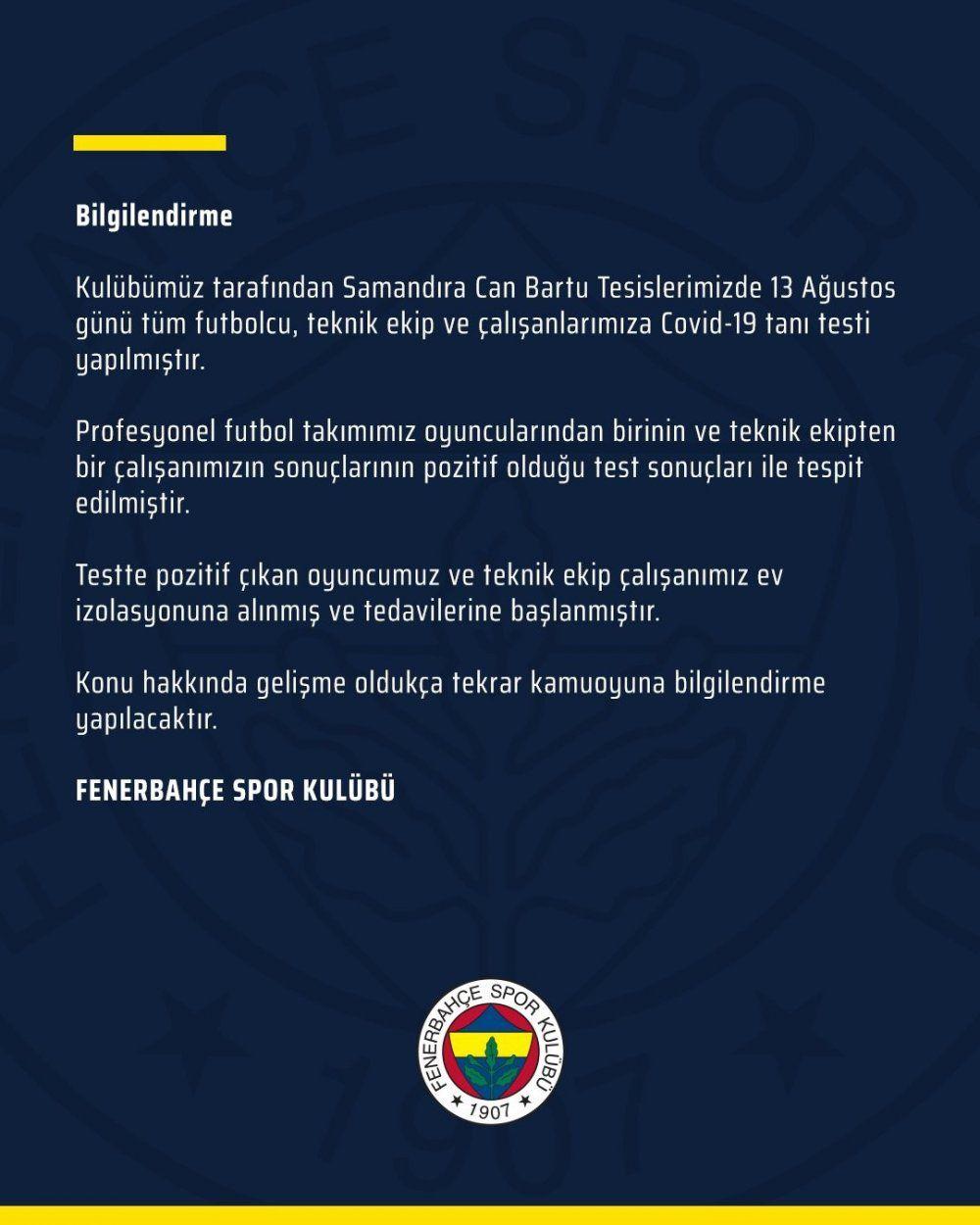 Fenerbahçe’de bugün yapılan korona virüs testlerinin sonucunda 1 futbolcu ve 1 teknik ekip çalışanında test sonucu pozitif çıktı. Kulüpten yapılan açıklamada futbolcu ve teknik ekip çalışanının izolasyona alındığı ve tedavilerine başlandığı belirtildi.