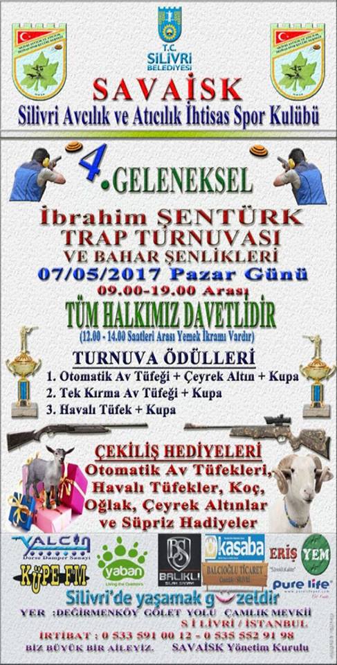 Silivri Atıcılık ve Avcılık İhtisas Spor Kulübü Derneği (SAVAİSK), 7 Mayıs'ta yapılacak trap atışları ve bahar şenlikleri için geniş bir organizasyon düzenliyor. Sadece avcı derneklerine değil, bölgedeki çiftçi ve tarım kuruluşlarına da davetiye gönderildiği öğrenildi. Silivri'deki sivil toplum kuruluşu temsilcileri, kamu kurum ve kuruluşu başkanları, siyasetçiler ve sporseverlerin 7 Mayıs'taki etkinliğe katılması bekleniyor.