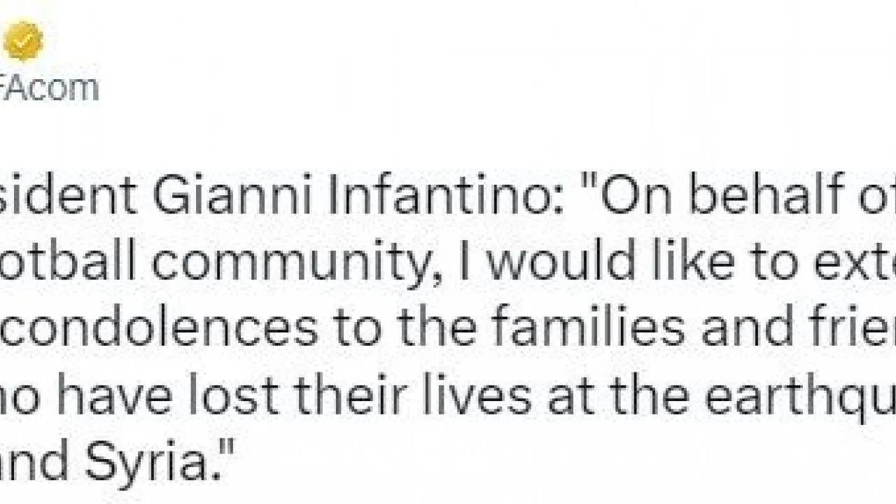 FIFA Başkanı Gianni Infantino, depremlerde hayatını kaybeden vatandaşlar için başsağlığı mesajı yayımladı.