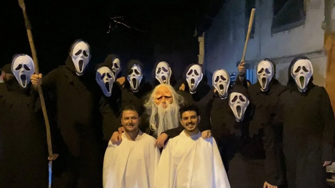 Yüzlerinde korkunç maskeler, ellerinde oraklarla damadı karşılayan gençlerin koreografisi film sahnelerini aratmadı.
