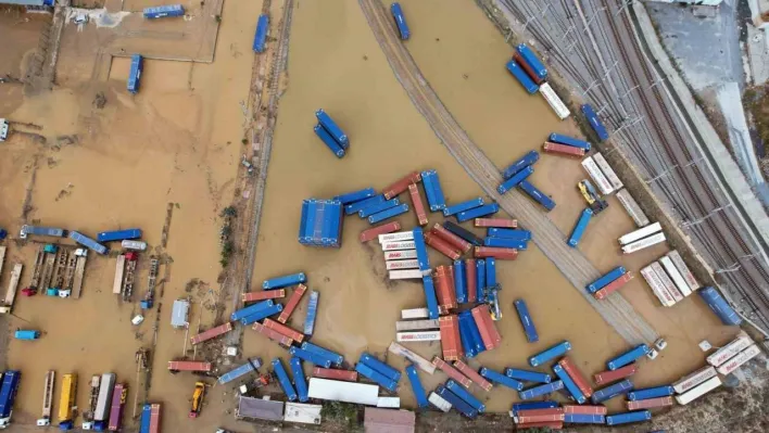 Dün akşam saatlerinde etkili olan sağanak yağış sonrası Halkalı Tren Garı adeta göle döndü. Havadan çekilen fotoğraflarda konteynırların yükselen su seviyesi nedeniyle çevreye saçıldığı dikkat çekti.