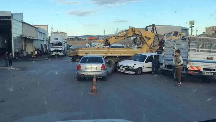 Balıkesir'in Bandırma ilçesinde akşam saatlerinde Bandırma Küçük Sanayi Sitesi'nde meydana gelen kazada iş makinesin frenleri tutmayınca park halindeki araçlara çarptı.
