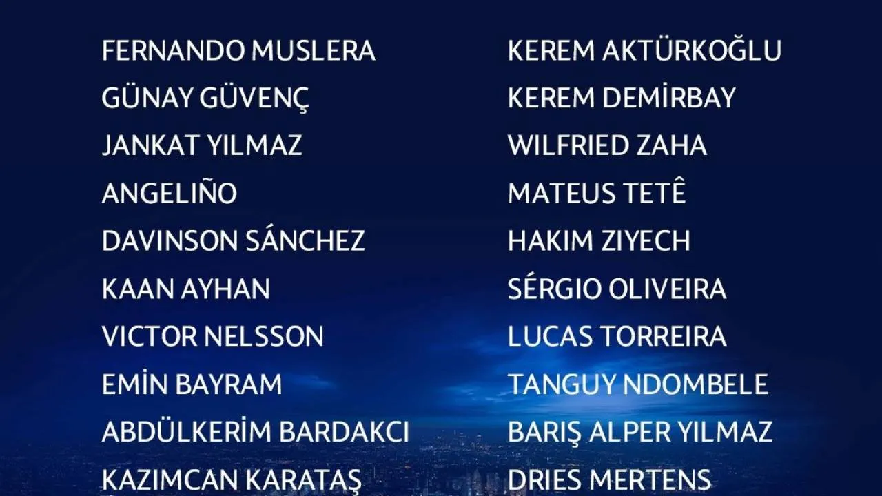 "Fernando Muslera, Günay Güvenç, Jankat Yılmaz, Angelino, Davinson Sanchez, Kaan Ayhan, Victor Nelsson, Emin Bayram, Abdülkerim Bardakcı, Kazımcan Karataş, Sacha Boey, Kerem Aktürkoğlu, Kerem Demirbay, Wilfried Zaha, Mateus Tete, Hakim Ziyech, Sergio Oliveira, Lucas Torreira, Tanguy Ndombele, Barış Alper Yılmaz, Dries Mertens, Mauro Icardi, Cedric Bakambu."
