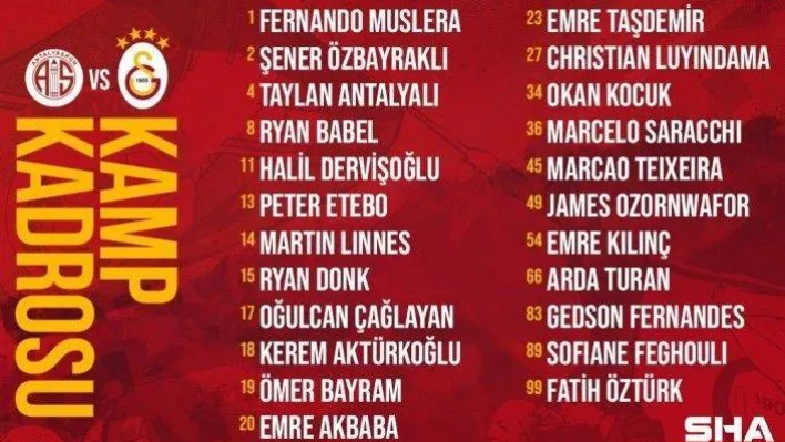 Teknik Direktör Fatih Terim’in Antalyaspor maçı kamp kadrosuna dahil ettiği futbolcular şöyle:"Fernando Muslera, Şener Özbayraklı, Taylan Antalyalı, Ryan Babel, Halil Dervişoğlu, Peter Etebo, Martin Linnes, Ryan Donk, Oğulcan Çağlayan, Kerem Aktürkoğlu, Ömer Bayram, Emre Akbaba, Emre Taşdemir, Christian Luyindama, Okan Kocuk, Marcelo Saracchi, Marcao Teixeira, James Ozornwafor, Emre Kılınç, Arda Turan, Gedson Fernandes, Sofiane Feghouli ve Fatih Öztürk"