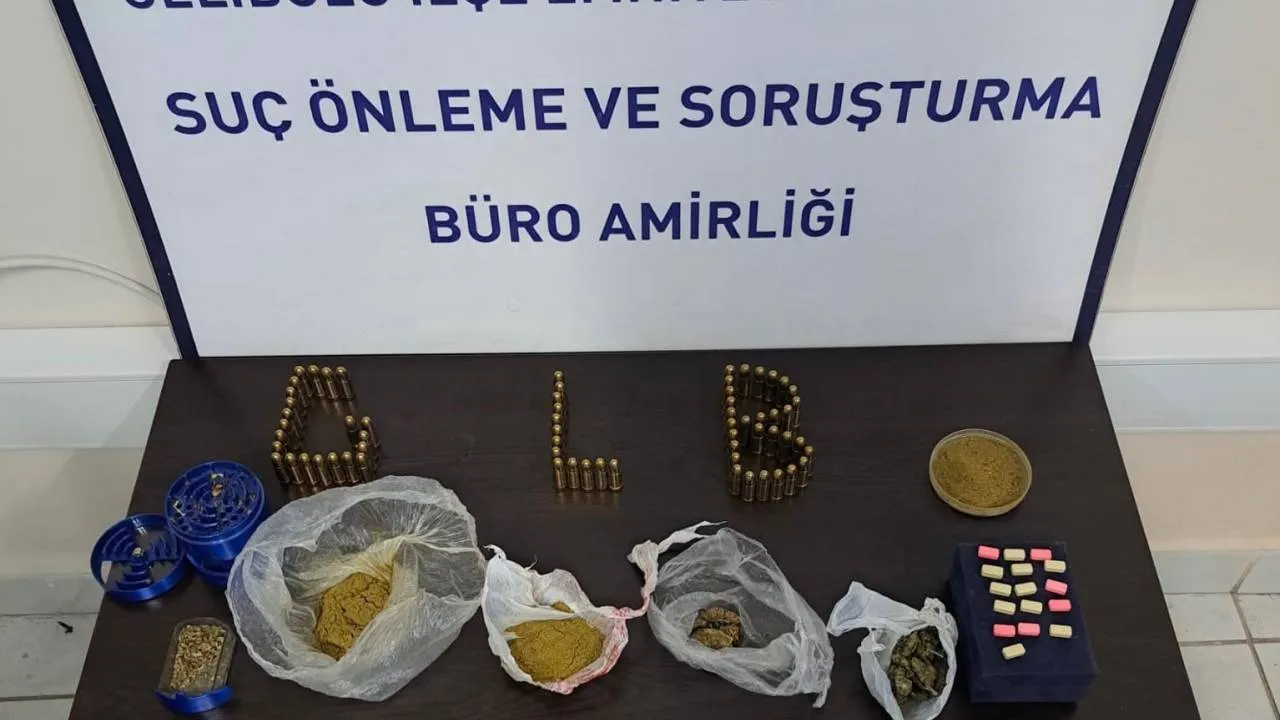 Gelibolu ilçe Emniyet Müdürlüğü Suç Önleme ve Soruşturma Büro Amirliği ekipleri uyuşturucu madde satışına yönelik çalışma çerçevesinde şüpheli Ç. Ş. üzerinde yapılan aramada uyuşturucu madde ele geçirdi. Şüphelinin ikametinde yapılan aramada 4.08 gram kubar esrar, 24.62 gram esrar, 15.8 gram skunk, 18.67 gram toz esrar, 16 extacy hap, 100 adet 9.9 mm fişek ele geçirildi. İkamette yapılan arama sırasında T.A. (39) ve B.K. (30) gözaltına alındı.