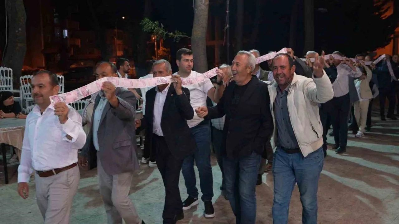 Bilecik’te bir düğünde gelin ile damada boyu 15 metreye ulaşan para kurdelesi takıldı.