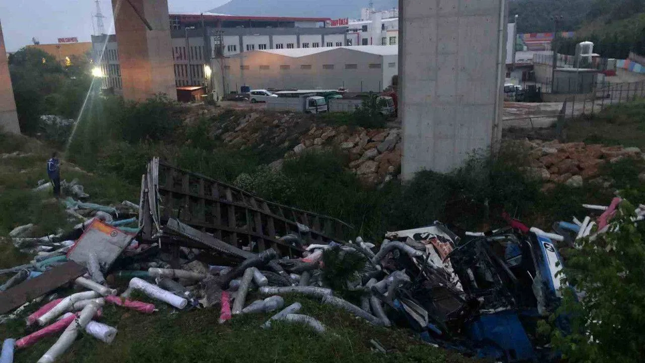 Yan yatan kumaş yüklü tır sürüklenerek bariyerlere çarptı. Bariyerleri aşan tır yaklaşık 60 metre yükseklikteki viyadükten dere yatağına düştü. İhbar üzerine olay yerine sağlık, polis ve itfaiye ekipleri sevk edildi. Dere yatağında paramparça olan tırın sürücüsü Alişan Eryılmaz’ın hayatını kaybettiğini tespit eden ekipler Eryılmaz’ın cesedini araç içinden çıkardı.