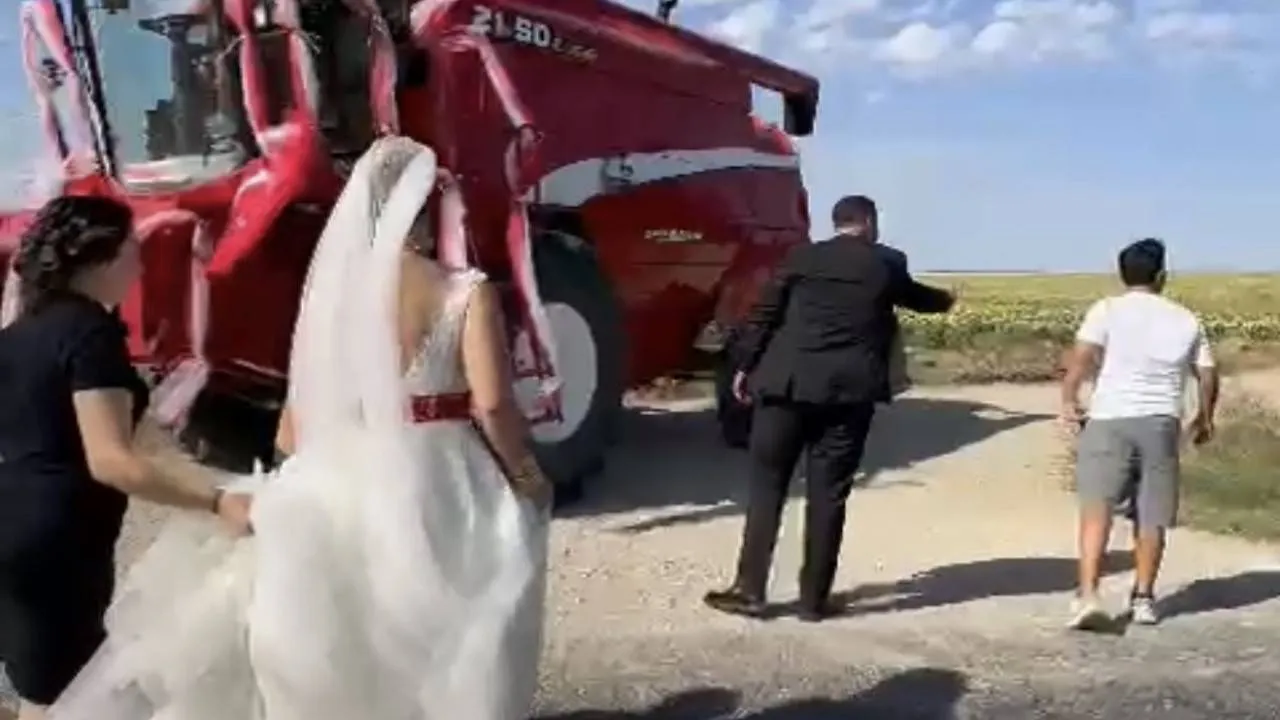 Edirne'nin Keşan ilçesinde, Nur Sena ve Mustafa Fıçı çiftinin düğününde, gelin arabası olarak biçerdöver kullanıldı.