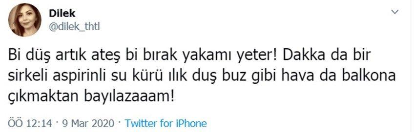 İstanbul’da özel bir hastanede kayıt görevlisi olarak çalışan 33 yaşındaki Dilek Tahtalı yeni tip korona virüse yenik düştü. Tahtalı'dan geriye kalan sosyal medya paylaşımları virüsün etkisini bir kez daha gözler önüne serdi. Tahtalı paylaşımlarında, “Bir düş artık ateş, bir bırak yakamı yeter! Dakikada bir sirkeli aspirinli su kürü, ılık duş, buz gibi havada balkona çıkmaktan bayılacağım” ifadelerini kullandı.