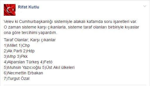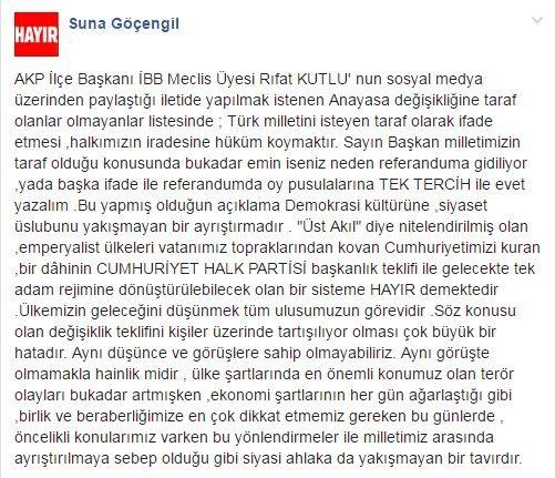 “AKP İlçe Başkanı İBB Meclis Üyesi Rıfat KUTLU'nun sosyal medya üzerinden paylaştığı iletide yapılmak istenen Anayasa değişikliğine taraf olanlar olmayanlar listesinde; Türk milletini isteyen taraf olarak ifade etmesi, halkımızın iradesine hüküm koymaktır. Sayın Başkan milletimizin taraf olduğu konusunda bu kadar emin iseniz neden referanduma gidiliyor, ya da başka ifade ile referandumda oy pusulalarına TEK TERCİH ile evet yazalım. Bu yapmış olduğun açıklama Demokrasi kültürüne, siyaset üslubunu yakışmayan bir ayrıştırmadır. "Üst Akıl" diye nitelendirilmiş olan, emperyalist ülkeleri vatanımız topraklarından kovan Cumhuriyetimizi kuran, bir dâhinin CUMHURİYET HALK PARTİSİ başkanlık teklifi ile gelecekte tek adam rejimine dönüştürülebilecek olan bir sisteme HAYIR demektedir. Ülkemizin geleceğini düşünmek tüm ulusumuzun görevidir. Söz konusu olan değişiklik teklifini kişiler üzerinde tartışılıyor olması çok büyük bir hatadır. Aynı düşünce ve görüşlere sahip olmayabiliriz. Aynı görüşte olmamakla hainlik midir, ülke şartlarında en önemli konumuz olan terör olayları bu kadar artmışken ,ekonomi şartlarının her gün ağarlaştığı gibi ,birlik ve beraberliğimize en çok dikkat etmemiz gereken bu günlerde , öncelikli konularımız varken bu yönlendirmeler ile milletimiz arasında ayrıştırılmaya sebep olduğu gibi siyasi ahlaka da yakışmayan bir tavırdır.”