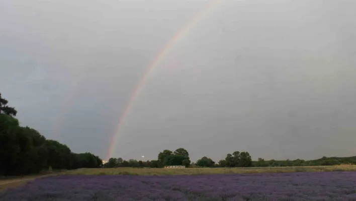 Edirne'de bulutlu havanın ardından ortaya çıkan gökkuşağı, mor renkli lavanta tarlalarıyla birleşerek seyrine doyulmaz bir manzara oluşturdu.