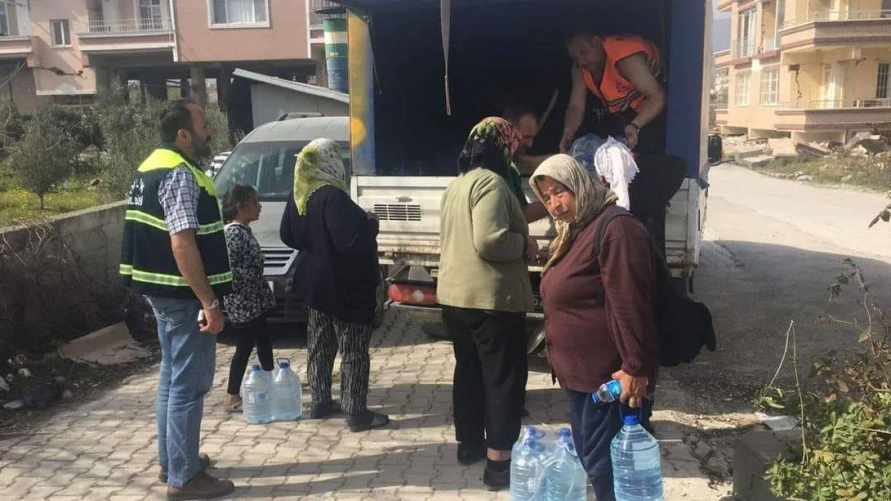 Deprem bölgesinde çalışmalarını sürdüren Gölcük Belediyesi ekipleri, Antakya ve Defne'deki mahallelerde bulunan depremzedelere içme suyu dağıttı.