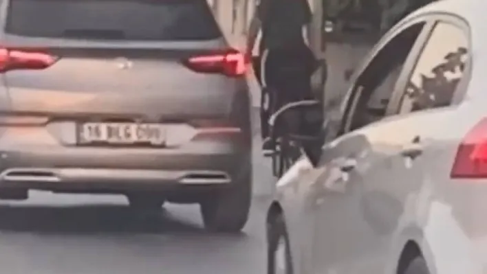 Bursa'da bir vatandaş, trafiğin aktığı caddede bisikletine ters binerek ilerledi. O anları gören sürücüler kısa süreli şok geçirse de cep telefonu kameraları ile kaydetti.