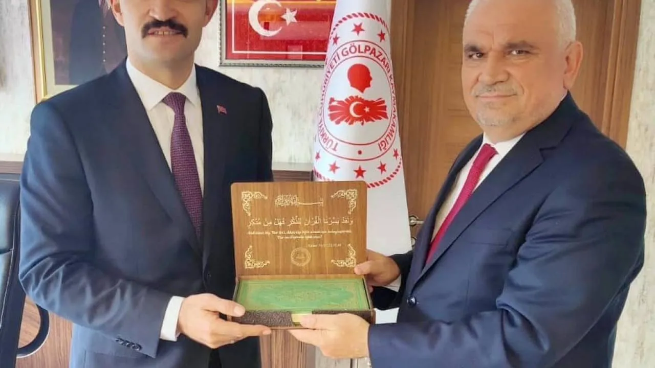 Bilecik İl Müftüsü Ali Erhun tarafından Gölpazarı Kaymakamı Alparslan Sözen'e hoş geldin hediyesi olarak Kur'anı Kerim takdim edildi.