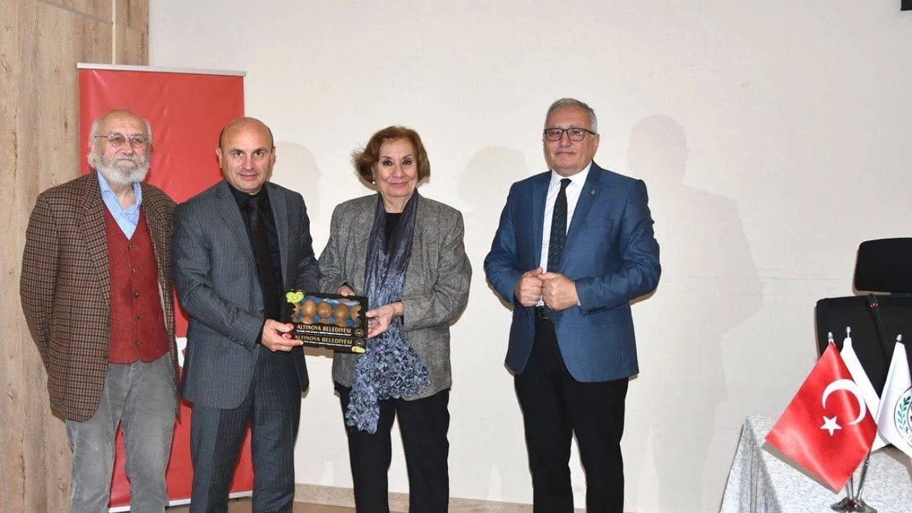 Söyleşi sonunda Altınova Belediye Başkanı Dr. Metin Oral, Gülsen Tuncer Ayça ve yönetmen eşi Engin Ayça ile Moderatör Vedat Akdamar’a Doğa Pasaportu, Altınova kivisi ve Altınova Belediyesi Doğa Eğitim Merkezi ve Engelsiz Tıbbi Aromatik Bitkiler Bahçesinde elde edilen bitki çaylarından hediyeler verdi.
