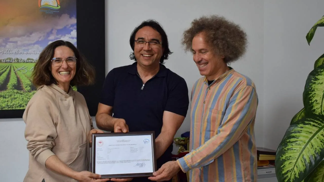 Silivri İlçe Tarım ve Orman Müdürü Nuri Ertuğrul, Gündönümü Çiftliği'nin sahiplerine Ari İşletme Sertifikasını teslim etti.