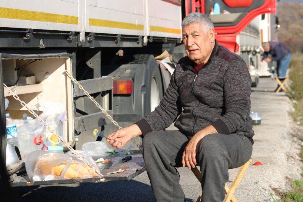 Tır kuyruğunda sıra bekleyen İbrahim Eravcı, ortalama 40 saat beklediklerini söyledi. Bu süre zarfında yanında getirdikleri yiyeceklerle ihtiyaçlarını karşıladıklarını belirten Eravcı, mini restoran dedikleri dolaplarda yemek hazırladıklarını anlattı.