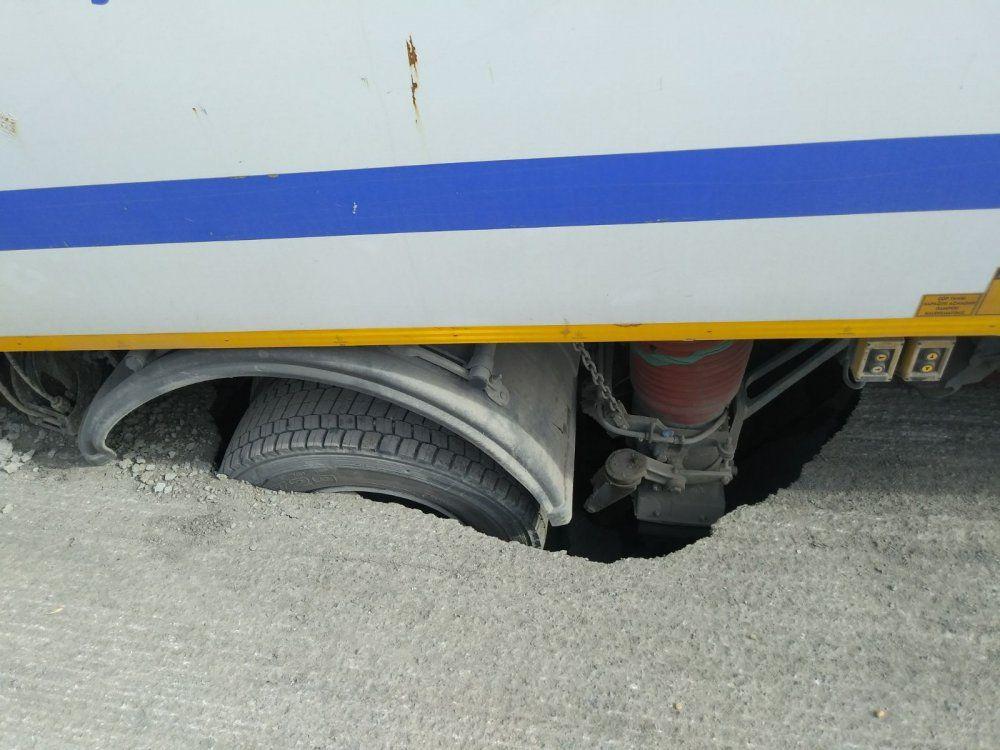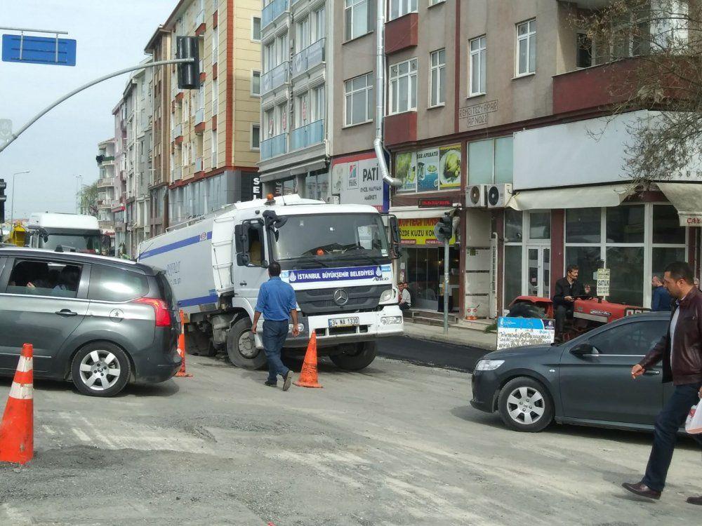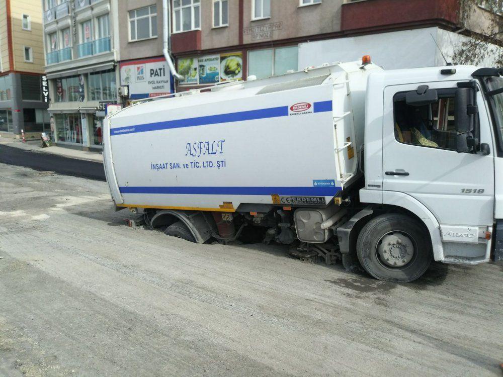 Silivri Eski Sanayi'de meydana gelen ilginç olayda, İBB'ye ait temizlik robotu kamyon asfaltın çökmesi sonucu yola saplandı.